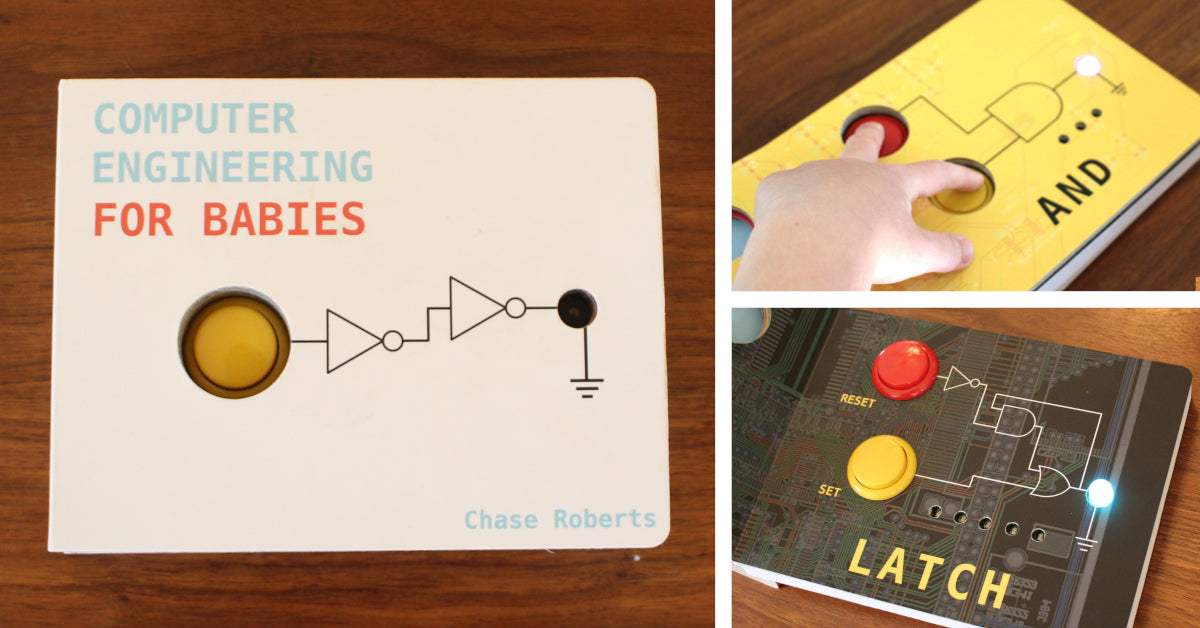 With two buttons and an LED, the original CE for Babies book explores basic computer logic gates, including NOT, OR, AND, XOR and a Latch. The book uses light sensors to detect which page is open and change the operands accordingly.
